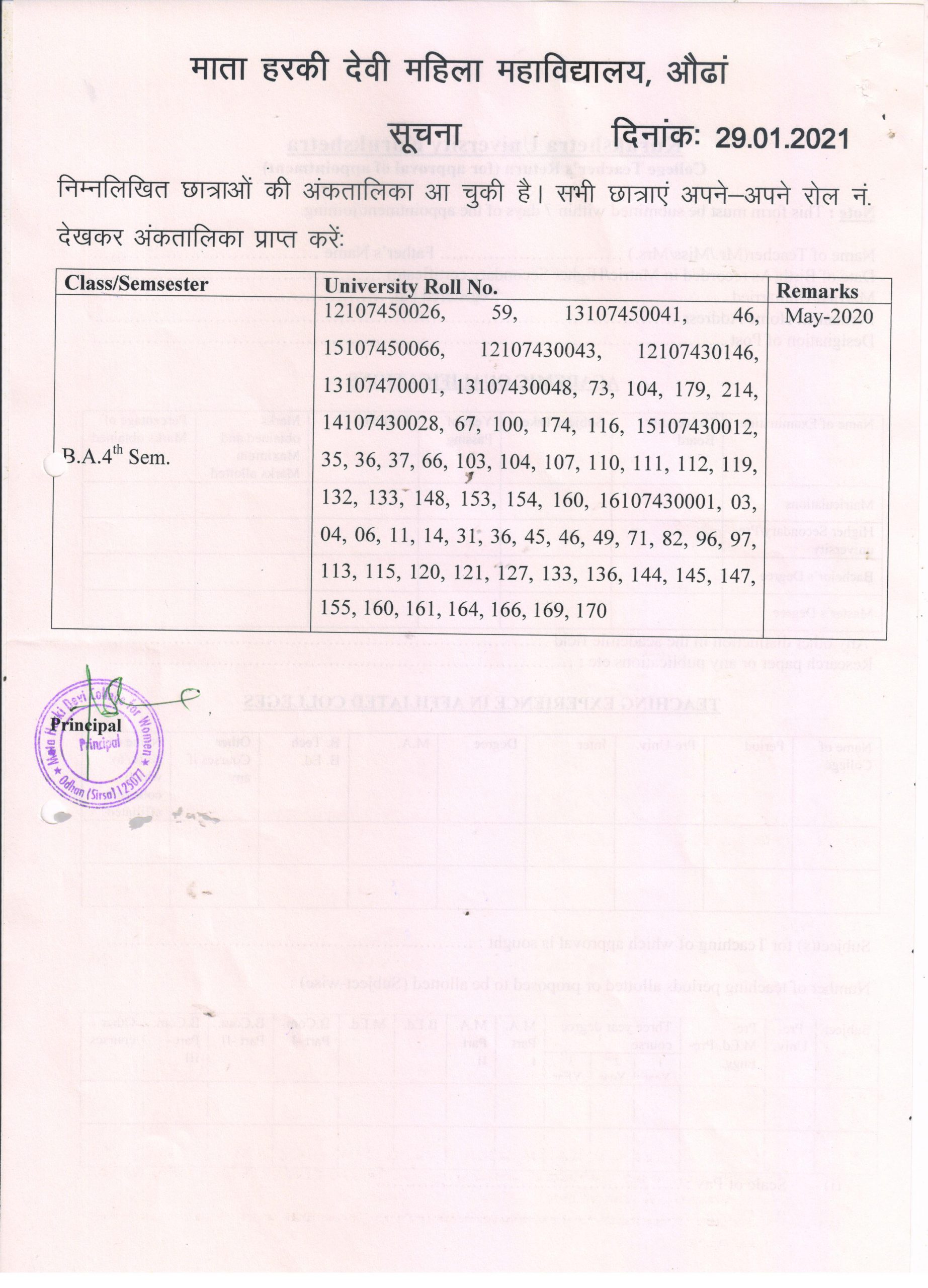 | B.A.6th Sem. | 170070430001 to 11, 13, 16 to 20, 22 to 26, 29 to 47, 49, 51 to 66, 69, 71, 73, 75, 76, 78, 79, 81, 82, 84 to 87, 89, 90, 92, 94, 96, 98 to 100, 102 to 104, 106 to 112, 114 to 122, 124 to 128, 130 to 133, 135 to 136, 138 to 142, 144, 145, 148 to 149, 152 to 156, 158 to 161, 163 to 167, 170 to 173 | May-2020 |