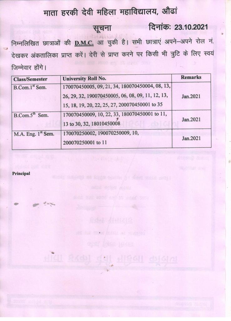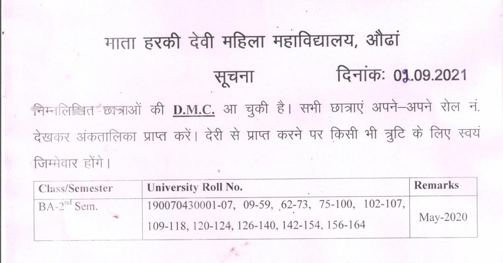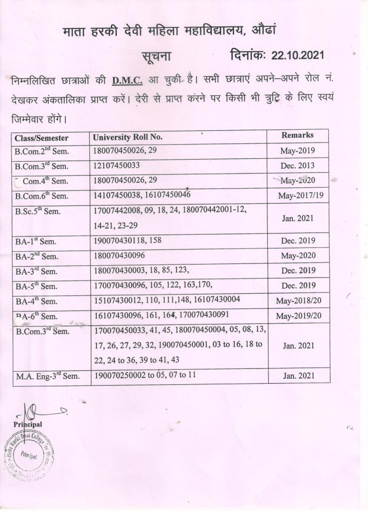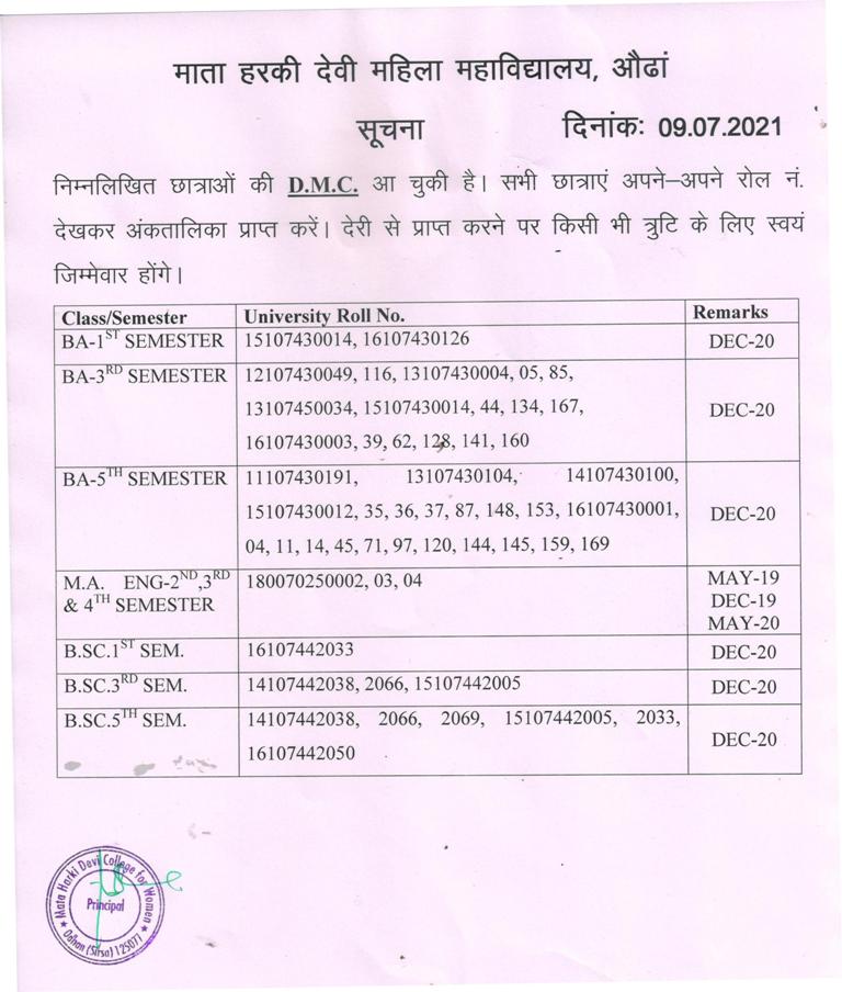 9. DMC OF B.A.3rd Sem., B.Com.2nd & 6th Sem. (Dec. 2019 & May-2020)